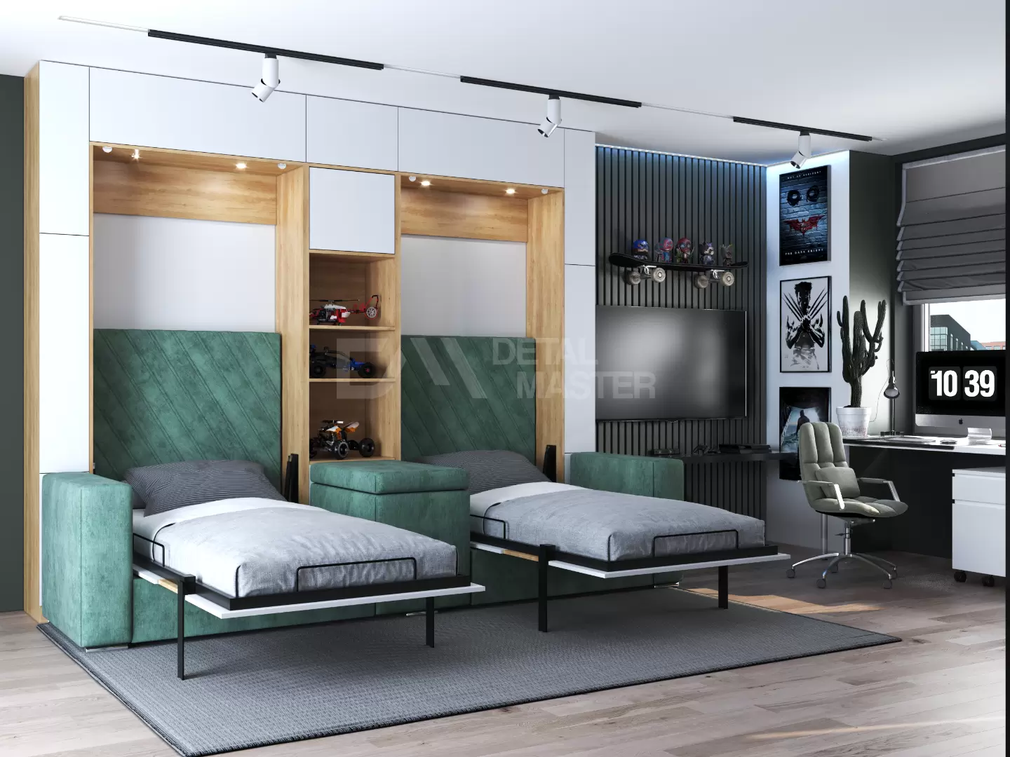 Детская шкаф-кровать с двумя спальными местами  "Twin 2.0" работает на механизме раскладывания собственной разработки "Balance". Кровать раскладывается легким движением руки, превращаясь в полноценное спальное место. Просто потяните за ножку-маятник, которая самостоятельно фиксируется в нужное положение при опускании.